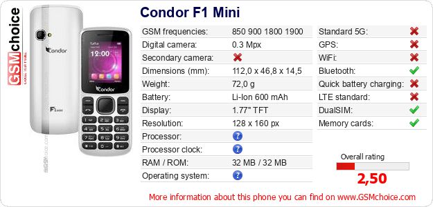 Do you have your website? Do you want to insert information about basic phone data of Condor F1 Mini somewhere? It is very easy. You can download the picture, or copy and paste the code below on the page:Pasting this code will display the following image: