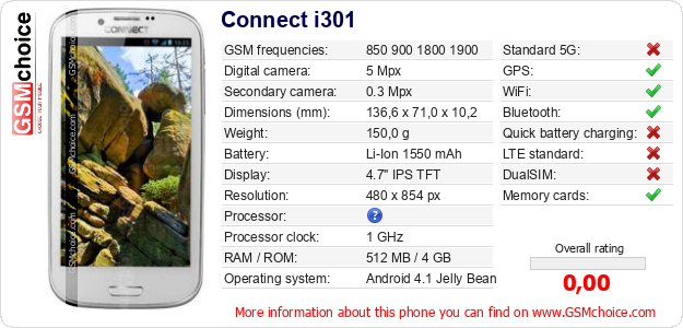Do you have your website? Do you want to insert information about basic phone data of Connect i301 somewhere? It is very easy. You can download the picture, or copy and paste the code below on the page:Pasting this code will display the following image: