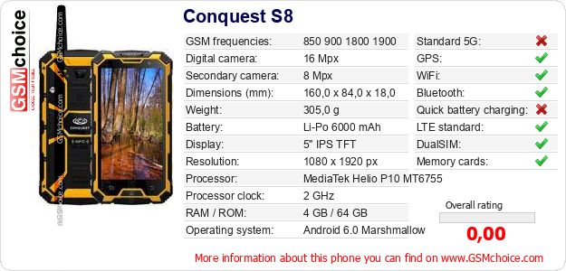 Do you have your website? Do you want to insert information about basic phone data of Conquest S8 somewhere? It is very easy. You can download the picture, or copy and paste the code below on the page:Pasting this code will display the following image: