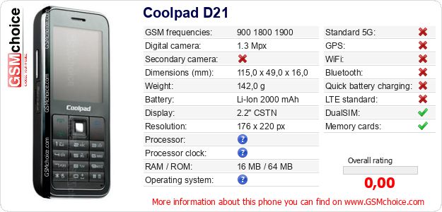 Do you have your website? Do you want to insert information about basic phone data of Coolpad D21 somewhere? It is very easy. You can download the picture, or copy and paste the code below on the page:Pasting this code will display the following image: