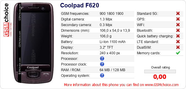 Do you have your website? Do you want to insert information about basic phone data of Coolpad F620 somewhere? It is very easy. You can download the picture, or copy and paste the code below on the page:Pasting this code will display the following image: