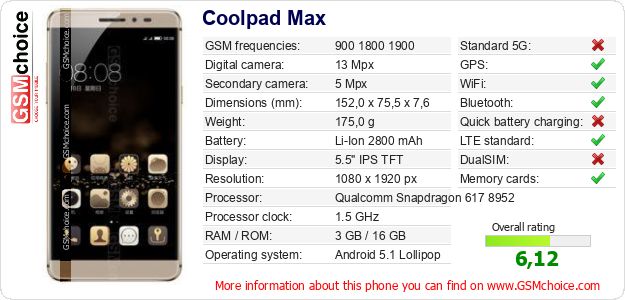 Do you have your website? Do you want to insert information about basic phone data of Coolpad Max somewhere? It is very easy. You can download the picture, or copy and paste the code below on the page:Pasting this code will display the following image: