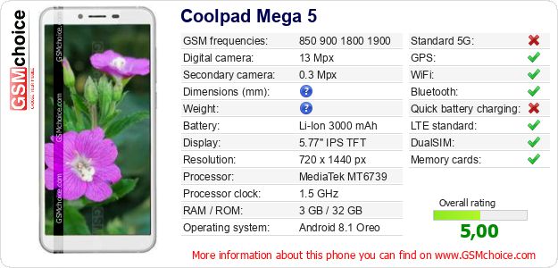 Do you have your website? Do you want to insert information about basic phone data of Coolpad Mega 5 somewhere? It is very easy. You can download the picture, or copy and paste the code below on the page:Pasting this code will display the following image: