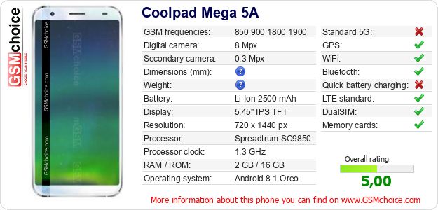 Do you have your website? Do you want to insert information about basic phone data of Coolpad Mega 5A somewhere? It is very easy. You can download the picture, or copy and paste the code below on the page:Pasting this code will display the following image: