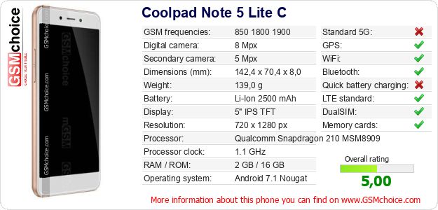 Do you have your website? Do you want to insert information about basic phone data of Coolpad Note 5 Lite C somewhere? It is very easy. You can download the picture, or copy and paste the code below on the page:Pasting this code will display the following image: