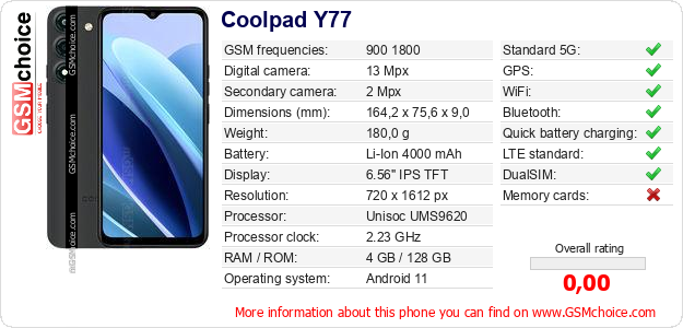 Do you have your website? Do you want to insert information about basic phone data of Coolpad Y77 somewhere? It is very easy. You can download the picture, or copy and paste the code below on the page:Pasting this code will display the following image: