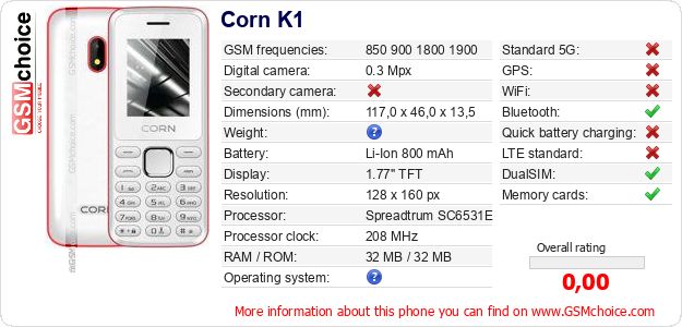 Do you have your website? Do you want to insert information about basic phone data of Corn K1 somewhere? It is very easy. You can download the picture, or copy and paste the code below on the page:Pasting this code will display the following image: