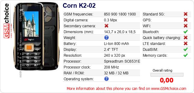 Do you have your website? Do you want to insert information about basic phone data of Corn K2-02 somewhere? It is very easy. You can download the picture, or copy and paste the code below on the page:Pasting this code will display the following image: