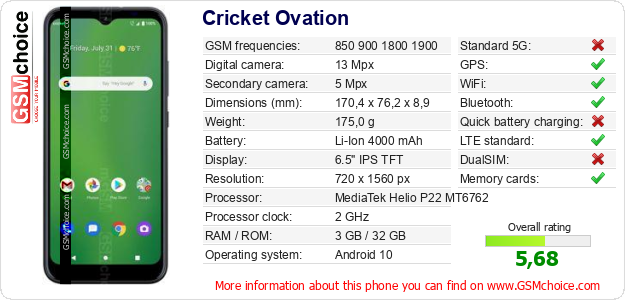 Do you have your website? Do you want to insert information about basic phone data of Cricket Ovation somewhere? It is very easy. You can download the picture, or copy and paste the code below on the page:Pasting this code will display the following image: