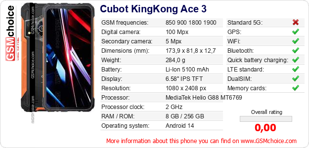 Do you have your website? Do you want to insert information about basic phone data of Cubot KingKong Ace 3 somewhere? It is very easy. You can download the picture, or copy and paste the code below on the page:Pasting this code will display the following image: