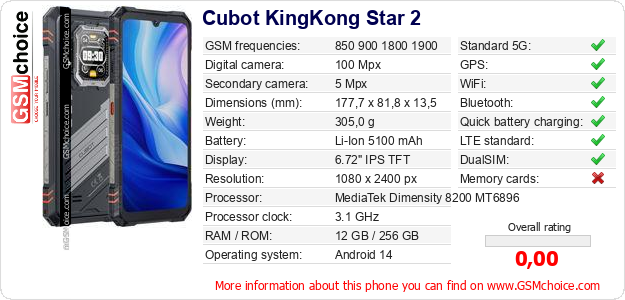 Do you have your website? Do you want to insert information about basic phone data of Cubot KingKong Star 2 somewhere? It is very easy. You can download the picture, or copy and paste the code below on the page:Pasting this code will display the following image: