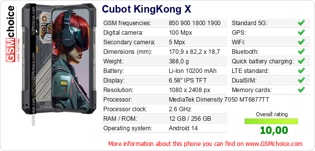 Do you have your website? Do you want to insert information about basic phone data of Cubot KingKong X somewhere? It is very easy. You can download the picture, or copy and paste the code below on the page:Pasting this code will display the following image: