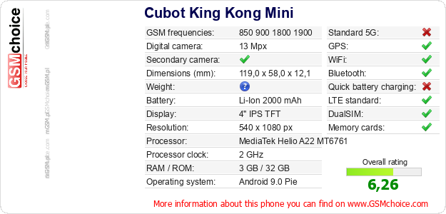 Do you have your website? Do you want to insert information about basic phone data of Cubot King Kong Mini somewhere? It is very easy. You can download the picture, or copy and paste the code below on the page:Pasting this code will display the following image: