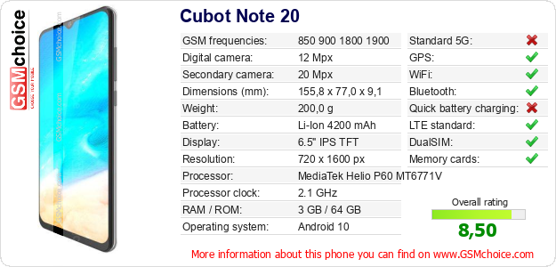 Do you have your website? Do you want to insert information about basic phone data of Cubot Note 20 somewhere? It is very easy. You can download the picture, or copy and paste the code below on the page:Pasting this code will display the following image:
