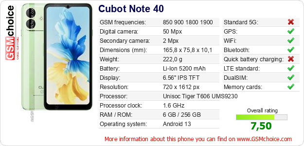 Do you have your website? Do you want to insert information about basic phone data of Cubot Note 40 somewhere? It is very easy. You can download the picture, or copy and paste the code below on the page:Pasting this code will display the following image: