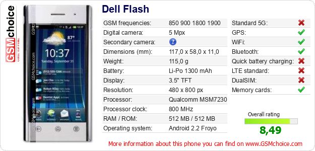 Do you have your website? Do you want to insert information about basic phone data of Dell Flash somewhere? It is very easy. You can download the picture, or copy and paste the code below on the page:Pasting this code will display the following image: