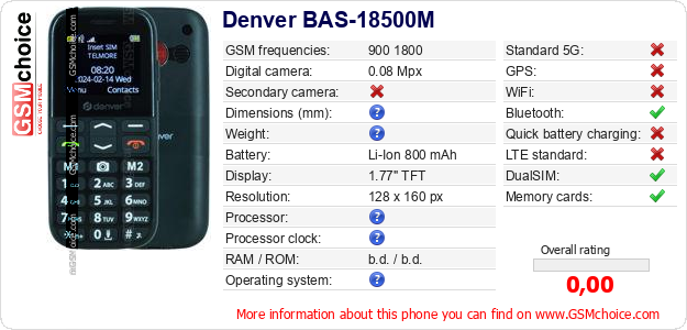 Do you have your website? Do you want to insert information about basic phone data of Denver BAS-18500M somewhere? It is very easy. You can download the picture, or copy and paste the code below on the page:Pasting this code will display the following image: