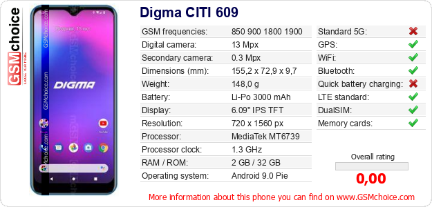 Do you have your website? Do you want to insert information about basic phone data of Digma CITI 609 somewhere? It is very easy. You can download the picture, or copy and paste the code below on the page:Pasting this code will display the following image: