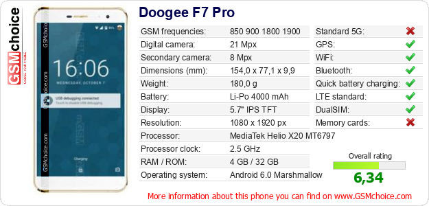 Do you have your website? Do you want to insert information about basic phone data of Doogee F7 Pro somewhere? It is very easy. You can download the picture, or copy and paste the code below on the page:Pasting this code will display the following image: