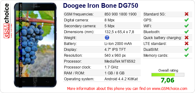 Do you have your website? Do you want to insert information about basic phone data of Doogee Iron Bone DG750 somewhere? It is very easy. You can download the picture, or copy and paste the code below on the page:Pasting this code will display the following image: