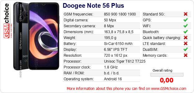 Do you have your website? Do you want to insert information about basic phone data of Doogee Note 56 Plus somewhere? It is very easy. You can download the picture, or copy and paste the code below on the page:Pasting this code will display the following image:
