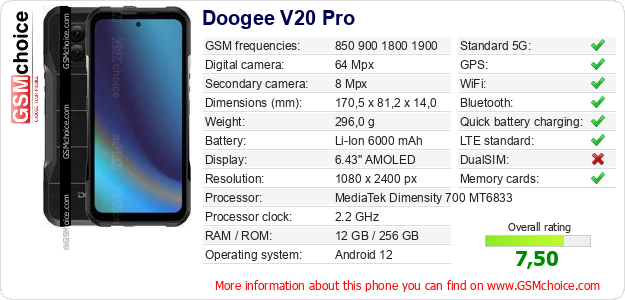 Do you have your website? Do you want to insert information about basic phone data of Doogee V20 Pro somewhere? It is very easy. You can download the picture, or copy and paste the code below on the page:Pasting this code will display the following image:
