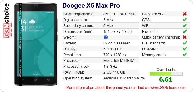 Do you have your website? Do you want to insert information about basic phone data of Doogee X5 Max Pro somewhere? It is very easy. You can download the picture, or copy and paste the code below on the page:Pasting this code will display the following image: