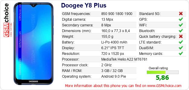 Do you have your website? Do you want to insert information about basic phone data of Doogee Y8 Plus somewhere? It is very easy. You can download the picture, or copy and paste the code below on the page:Pasting this code will display the following image: