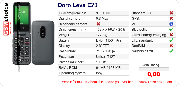 Do you have your website? Do you want to insert information about basic phone data of Doro Leva E20 somewhere? It is very easy. You can download the picture, or copy and paste the code below on the page:Pasting this code will display the following image: