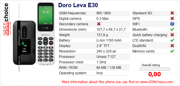 Do you have your website? Do you want to insert information about basic phone data of Doro Leva E30 somewhere? It is very easy. You can download the picture, or copy and paste the code below on the page:Pasting this code will display the following image: