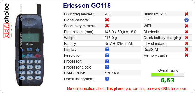 Do you have your website? Do you want to insert information about basic phone data of Ericsson GO118 somewhere? It is very easy. You can download the picture, or copy and paste the code below on the page:Pasting this code will display the following image: