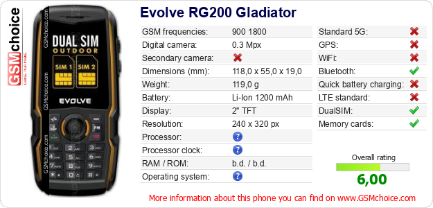 Do you have your website? Do you want to insert information about basic phone data of Evolve RG200 Gladiator somewhere? It is very easy. You can download the picture, or copy and paste the code below on the page:Pasting this code will display the following image:
