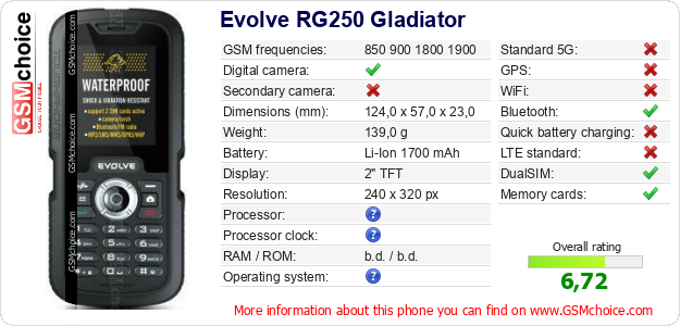 Do you have your website? Do you want to insert information about basic phone data of Evolve RG250 Gladiator somewhere? It is very easy. You can download the picture, or copy and paste the code below on the page:Pasting this code will display the following image: