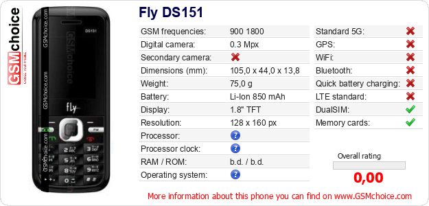 Do you have your website? Do you want to insert information about basic phone data of Fly DS151 somewhere? It is very easy. You can download the picture, or copy and paste the code below on the page:Pasting this code will display the following image: