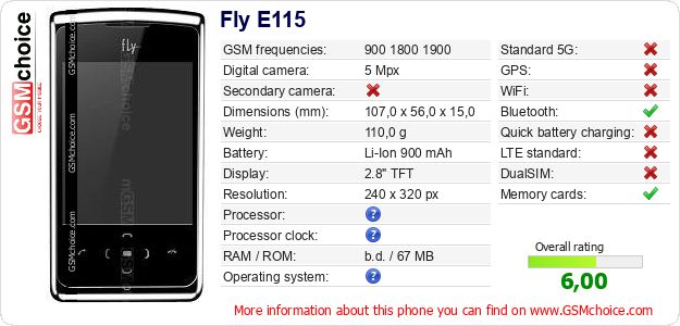 Do you have your website? Do you want to insert information about basic phone data of Fly E115 somewhere? It is very easy. You can download the picture, or copy and paste the code below on the page:Pasting this code will display the following image: