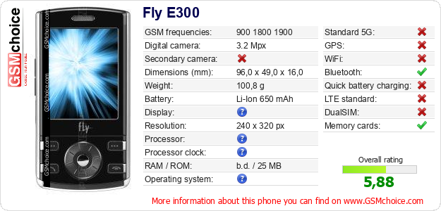 Do you have your website? Do you want to insert information about basic phone data of Fly E300 somewhere? It is very easy. You can download the picture, or copy and paste the code below on the page:Pasting this code will display the following image: