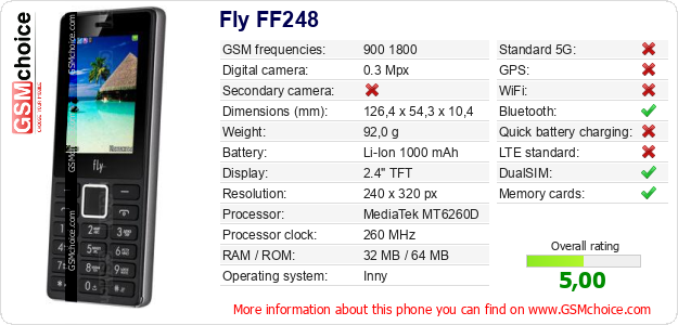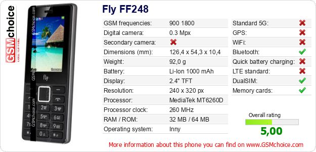 Do you have your website? Do you want to insert information about basic phone data of Fly FF248 somewhere? It is very easy. You can download the picture, or copy and paste the code below on the page:Pasting this code will display the following image: