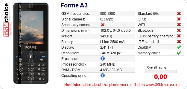 Do you have your website? Do you want to insert information about basic phone data of Forme A3 somewhere? It is very easy. You can download the picture, or copy and paste the code below on the page:Pasting this code will display the following image: