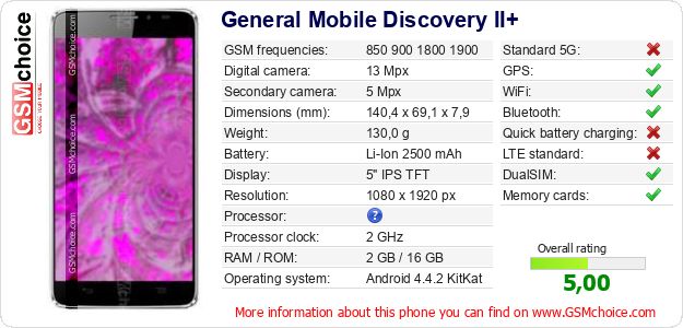 Do you have your website? Do you want to insert information about basic phone data of General Mobile Discovery II+ somewhere? It is very easy. You can download the picture, or copy and paste the code below on the page:Pasting this code will display the following image: