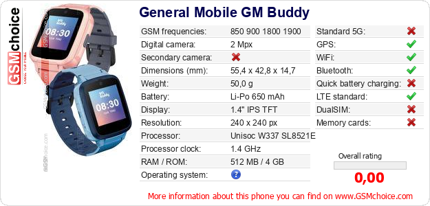 Do you have your website? Do you want to insert information about basic phone data of General Mobile GM Buddy somewhere? It is very easy. You can download the picture, or copy and paste the code below on the page:Pasting this code will display the following image:
