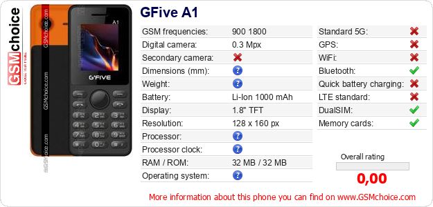 Do you have your website? Do you want to insert information about basic phone data of GFive A1 somewhere? It is very easy. You can download the picture, or copy and paste the code below on the page:Pasting this code will display the following image: