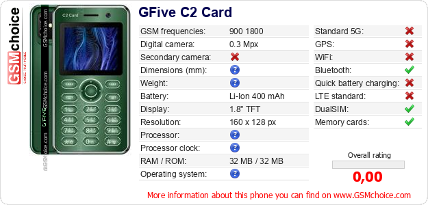 Do you have your website? Do you want to insert information about basic phone data of GFive C2 Card somewhere? It is very easy. You can download the picture, or copy and paste the code below on the page:Pasting this code will display the following image: