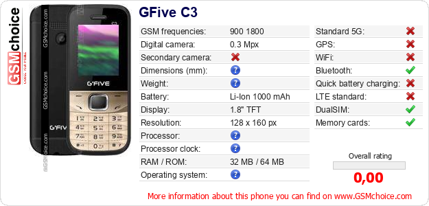 Do you have your website? Do you want to insert information about basic phone data of GFive C3 somewhere? It is very easy. You can download the picture, or copy and paste the code below on the page:Pasting this code will display the following image: