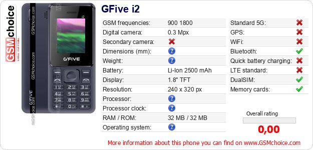 Do you have your website? Do you want to insert information about basic phone data of GFive i2 somewhere? It is very easy. You can download the picture, or copy and paste the code below on the page:Pasting this code will display the following image:
