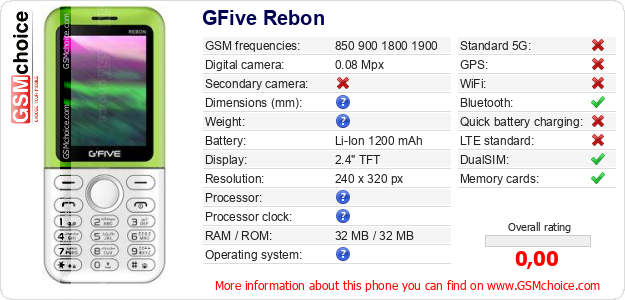 Do you have your website? Do you want to insert information about basic phone data of GFive Rebon somewhere? It is very easy. You can download the picture, or copy and paste the code below on the page:Pasting this code will display the following image: