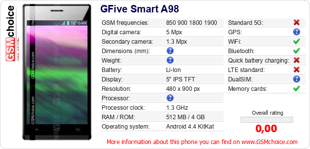 Do you have your website? Do you want to insert information about basic phone data of GFive Smart A98 somewhere? It is very easy. You can download the picture, or copy and paste the code below on the page:Pasting this code will display the following image: