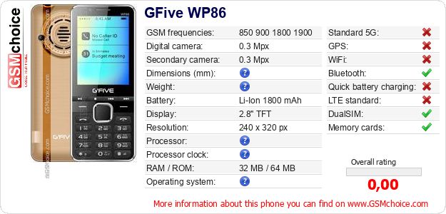 Do you have your website? Do you want to insert information about basic phone data of GFive WP86 somewhere? It is very easy. You can download the picture, or copy and paste the code below on the page:Pasting this code will display the following image: