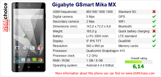 Do you have your website? Do you want to insert information about basic phone data of Gigabyte GSmart Mika MX somewhere? It is very easy. You can download the picture, or copy and paste the code below on the page:Pasting this code will display the following image: