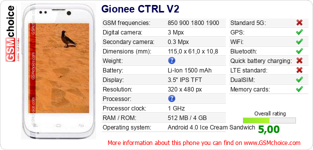 Do you have your website? Do you want to insert information about basic phone data of Gionee CTRL V2 somewhere? It is very easy. You can download the picture, or copy and paste the code below on the page:Pasting this code will display the following image: