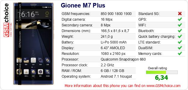 Do you have your website? Do you want to insert information about basic phone data of Gionee M7 Plus somewhere? It is very easy. You can download the picture, or copy and paste the code below on the page:Pasting this code will display the following image: